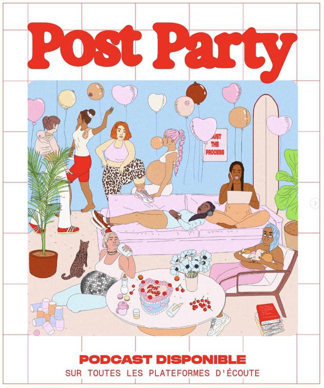 EN 2025, j’ai créé Post Party — un podcast qui sensibilise aux enjeux du post-partum en mêlant conversation et divertissement, dans lequel j’invite des artistes, journalistes et personnalités à raconter leur débuts dans la parentalité.